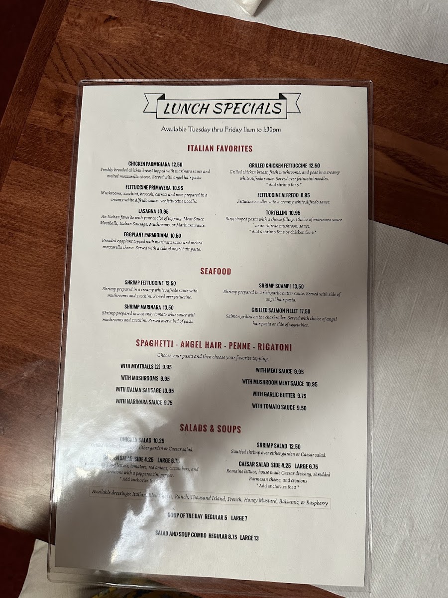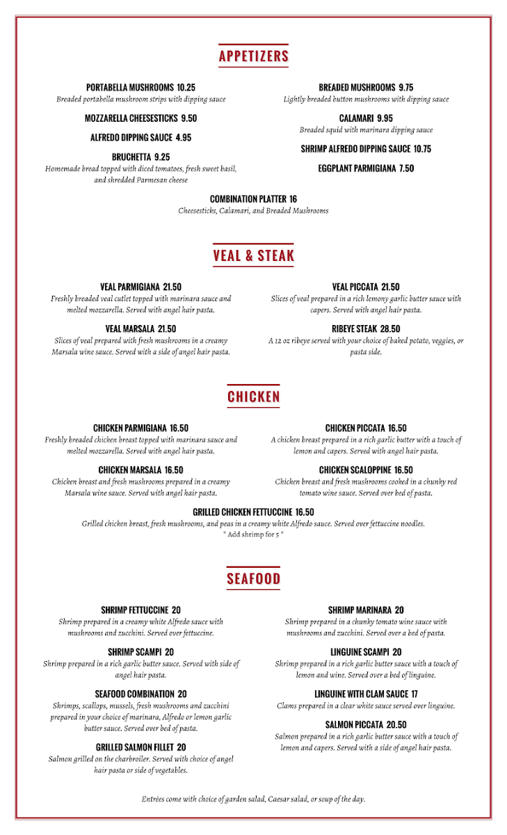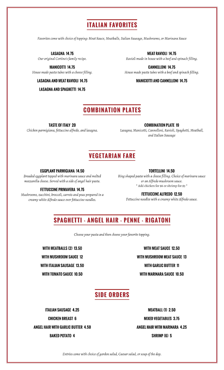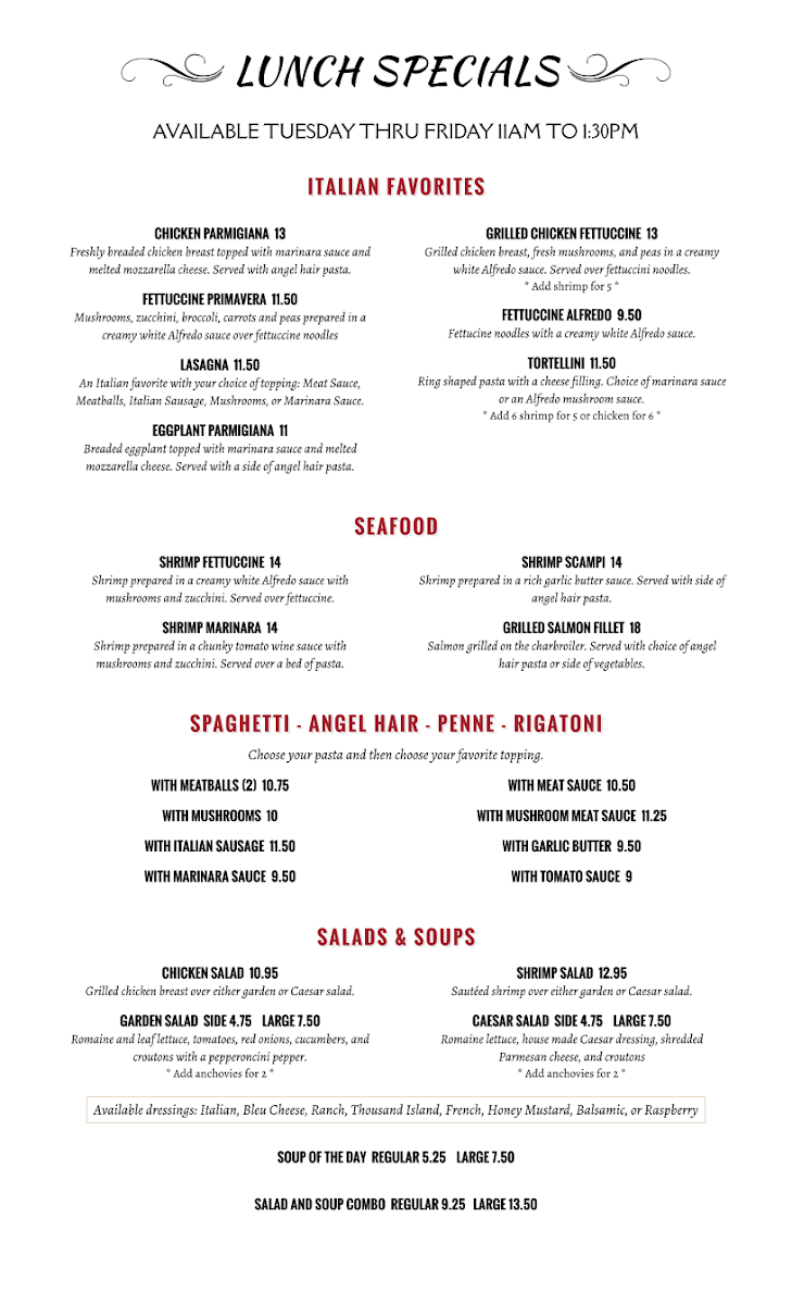With Meat Sauce. Choose Your Salad Choice: Garden Salad, Caesar Salad, Soup Of The Day